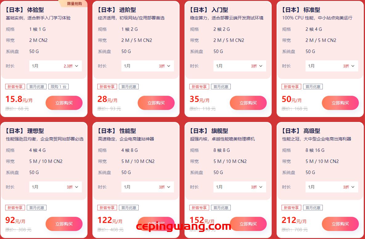 | 日本云 | 2核4G | 50G(SSD) | 2M/5M(CN2) | 50元/月 | 403元/年(原价2016元) | |